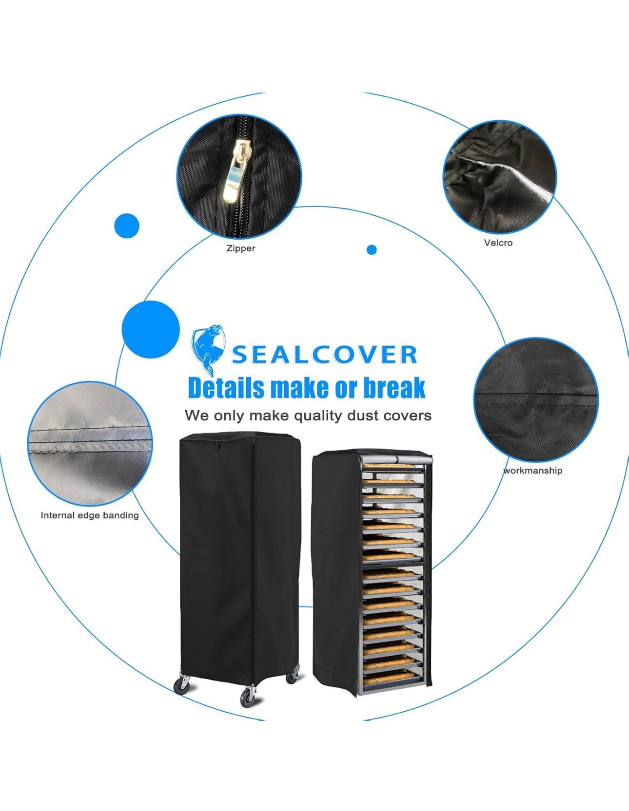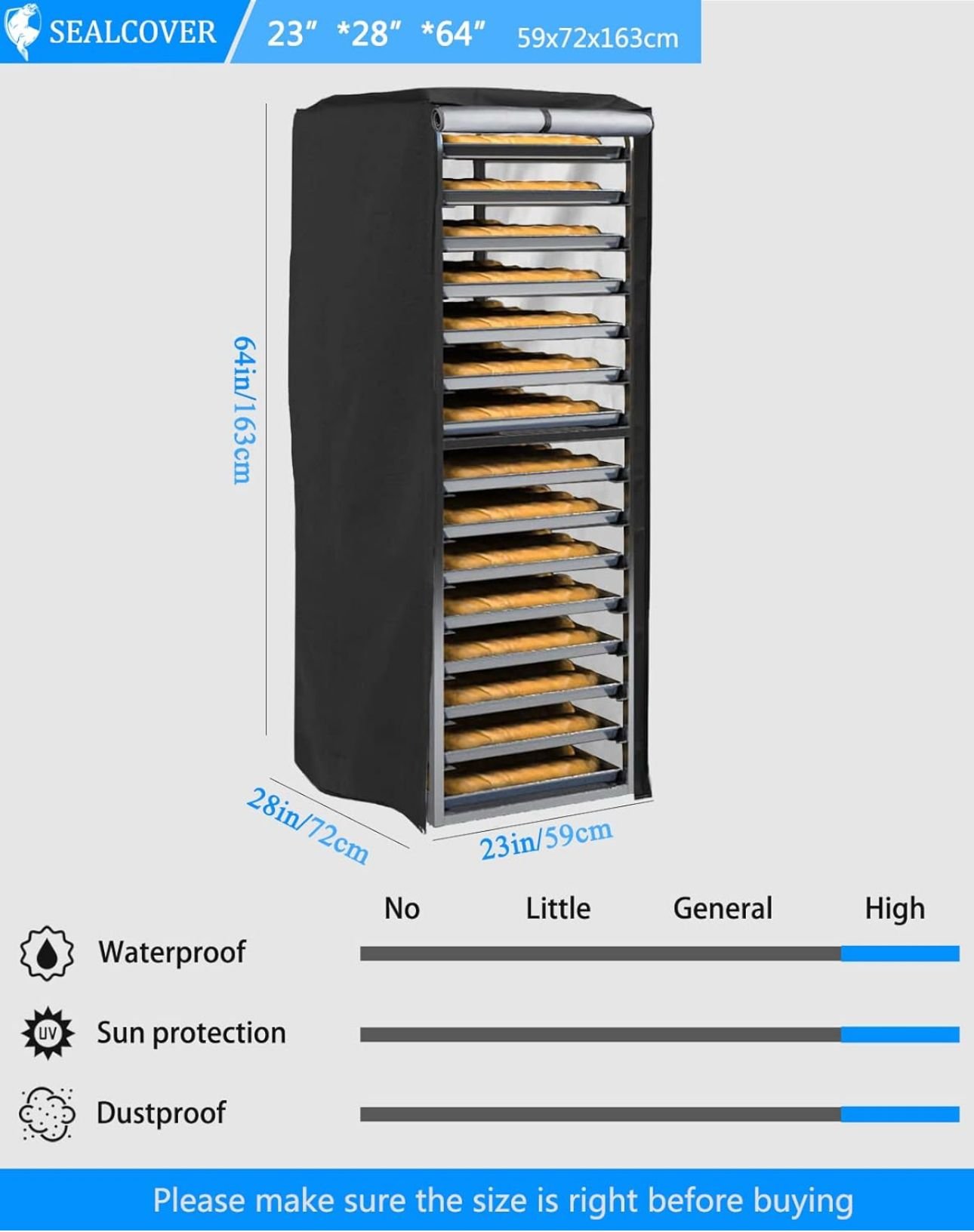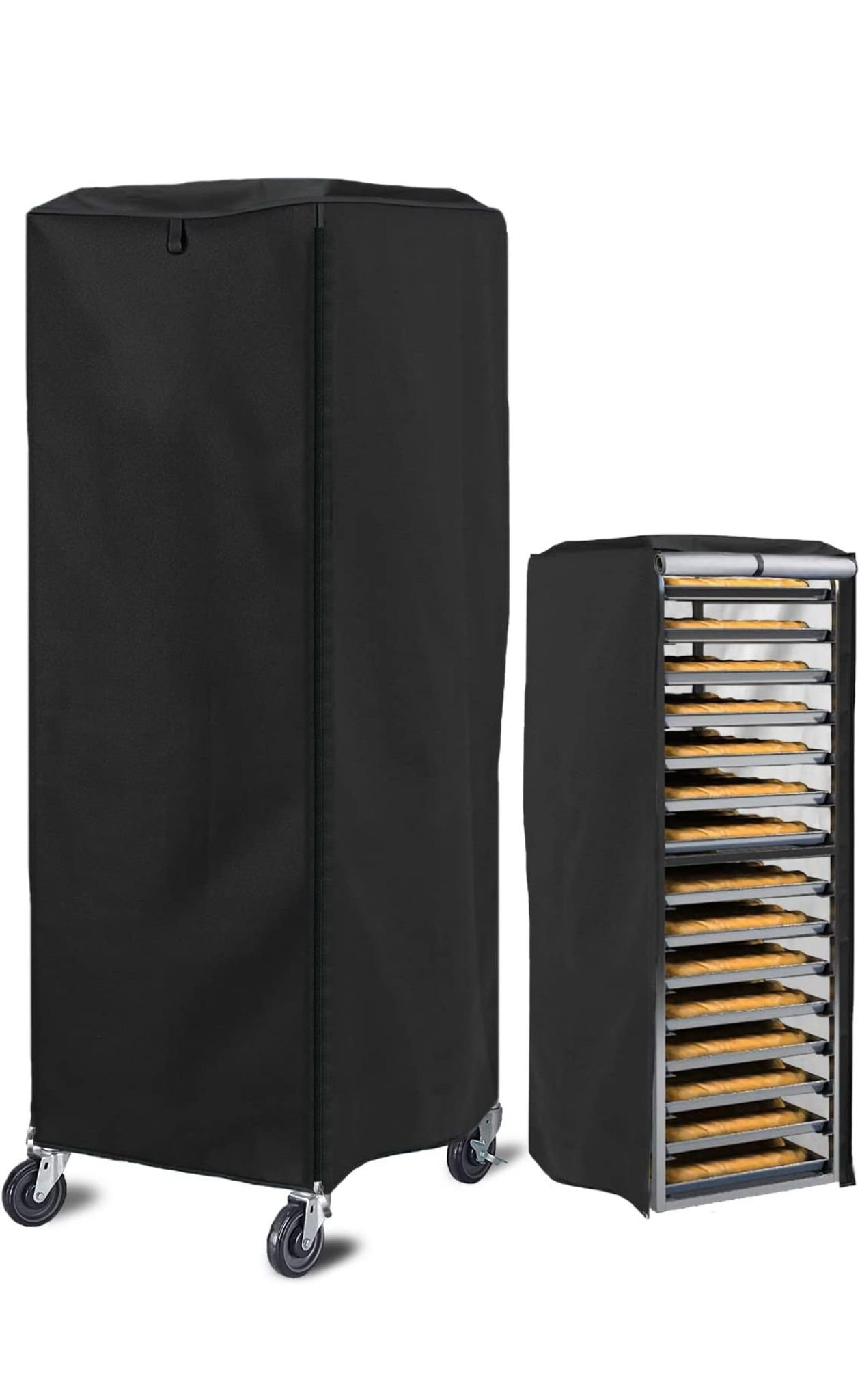 Durable dust cover for commercial bakery racks — waterproof, dustproof, and sunproof with easy-access zippers. Keeps your food clean and protected.